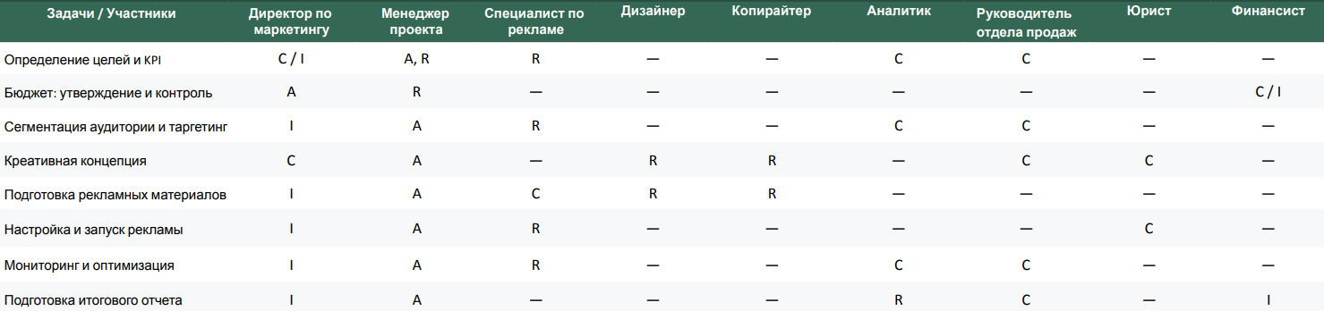 A-участник (ответственный): менеджер проекта, который несет ответственность за выполнение задач в срок, за качество и за согласование с директором по маркетингу. Однако за утверждение бюджета ответственен директор по маркетингу.