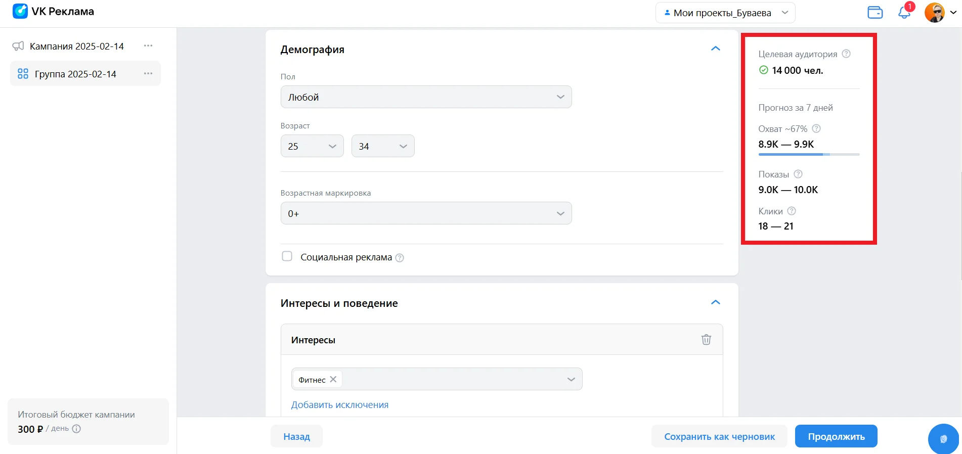 Часть данных для расчета медиаплана можно взять из рекламных кабинетов. Например, Директ покажет примерное количество кликов в зависимости от ключевого слова и объема трафика, а VK Реклама спрогнозирует охват ЦА в рамках кампании.