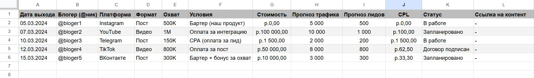 Формат медиаплана может меняться в зависимости от специфики проекта и канала продвижения, но обычно в него входят столбцы со следующими данными: