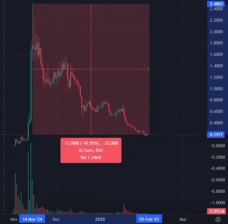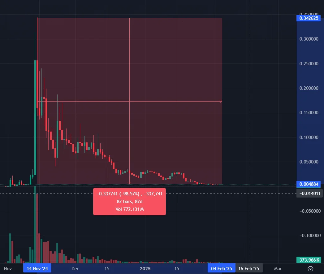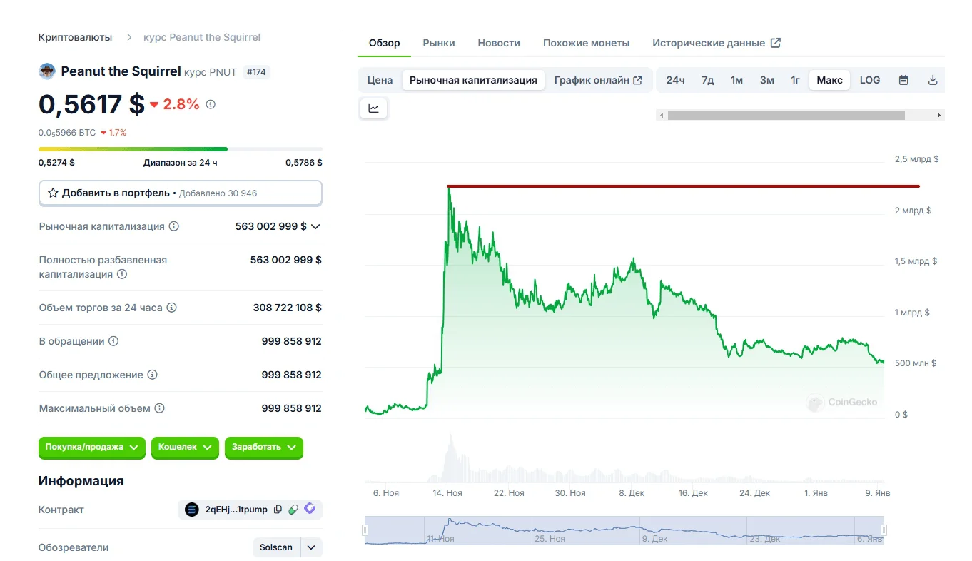 Затем нарратив потух и монеты с животными сильно упали в цене. Сейчас PNUT стоит на 92% дешевле, чем на пике популярности.