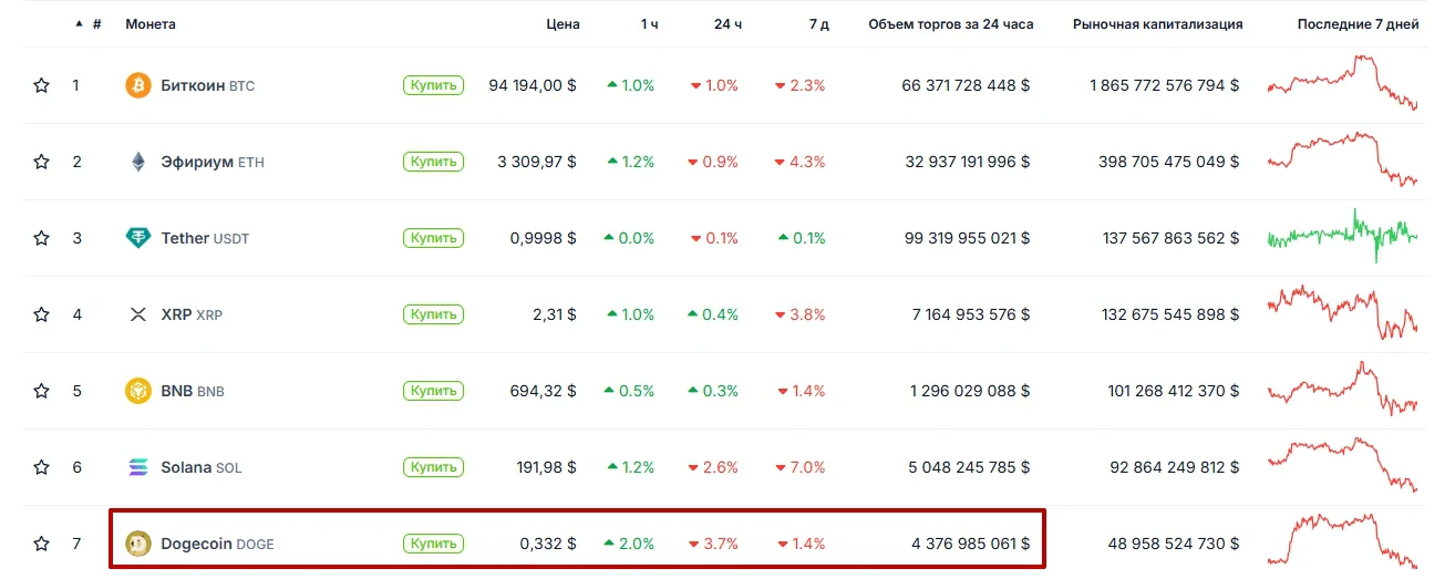 В январе 2025 года криптовалюта с собакой занимает 7 строчку среди всех криптовалют и имеет капитализацию 49 млрд долларов.