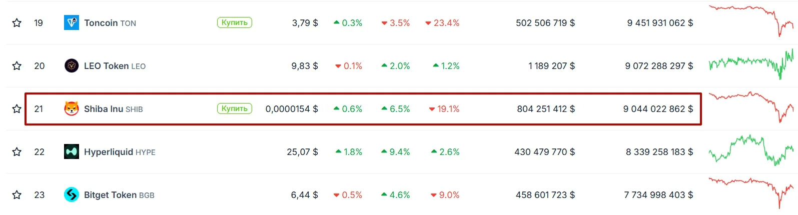 Но ни одной криптовалюте не удалось вытеснить Dogecoin. Только один раз SHIB оценивался дороже Dogecoin, но потом быстро потерял позиции. Сейчас SHIB занимает 21 строчку среди всех криптовалют и имеет капитализацию 9 млрд долларов.