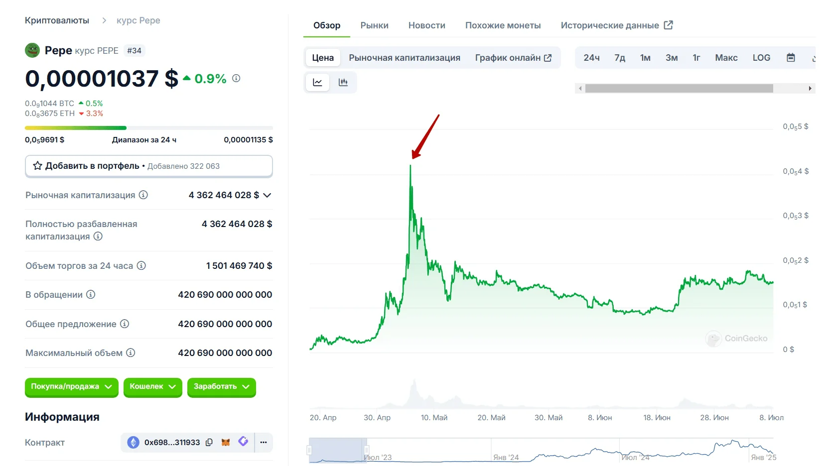Еще один популярный мемкоин — Pepe. Его запустили весной 2023 года и монета сразу стала популярной. Уже через сутки торгов курс вырос на 900%. А еще через 3 недели рыночная капитализация крипты превысила 1,6 млрд долларов.
