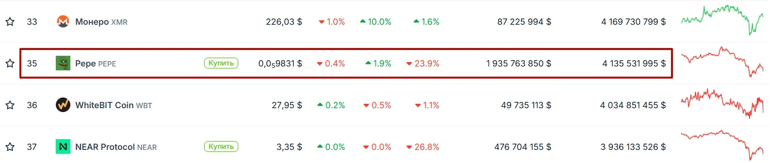 Обсуждение PEPE подхватили инфлюенсеры в X и в тематических каналах мессенджеров Telegram и Discord, поэтому монета стала быстро набирать популярность. Аудитория сильно полюбила проект, поэтому сейчас он занимает 35 строчку среди всех криптовалют и имеет капитализацию 4 млрд долларов.