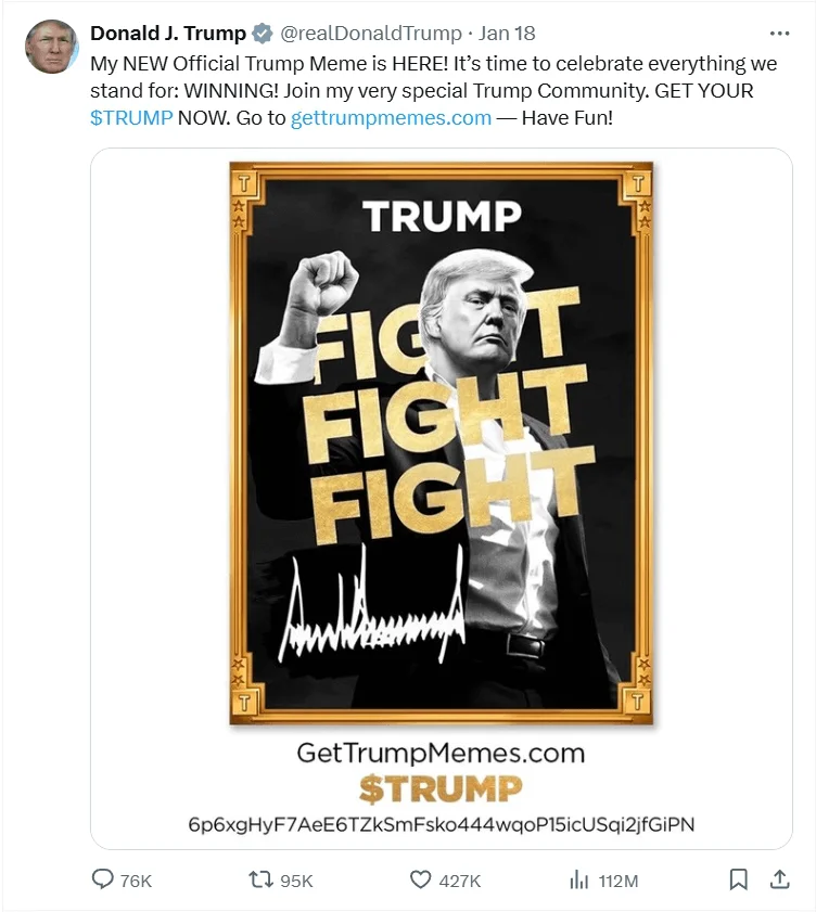 «Пришло время отпраздновать все, за что мы выступаем: ПОБЕДУ!» — написал политик и приложил ссылку на личный мемкоин. Логотипом монеты стало изображение самого Дональда Трампа, поднимающего кулак сразу после покушения 13 июля 2024 г.