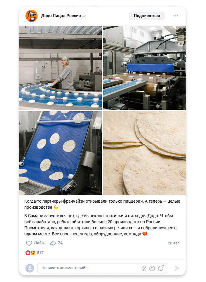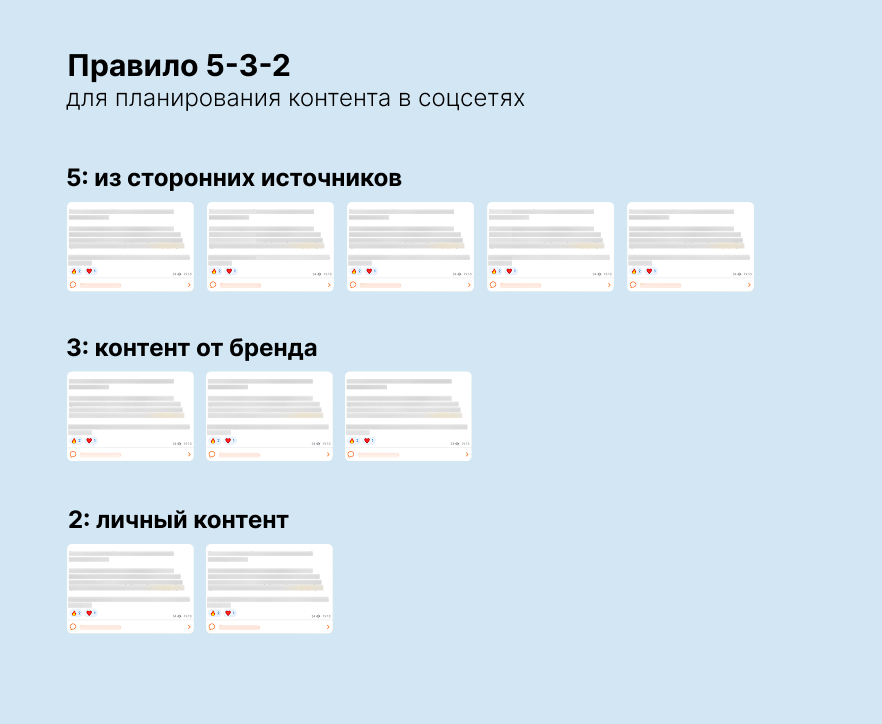 - Бренд планирует контент так: 5 берёт из сторонних источников, 3 создаёт сам, 2 — делится личными постами. Если публикует редко ― схему можно адаптировать, например 50% ― 30% ― 20%.