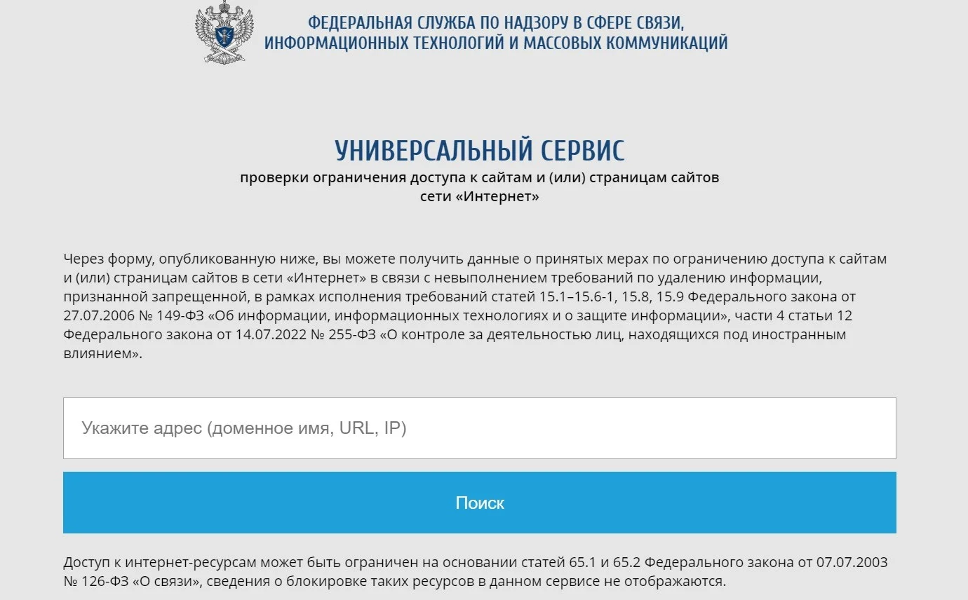 Проверить, активен ли сайт на территории РФ. Из-за публикации запрещенной в стране информации РКН может блокировать некоторые сайты. Основание ― исполнение требований статей 15.1–15.6-1, 15.8, 15.9 ФЗ № 149 «Об информации, информационных технологиях и о защите информации», ч. 4 ст. 12 ФЗ № 255 «О контроле за деятельностью лиц, находящихся под иностранным влиянием».