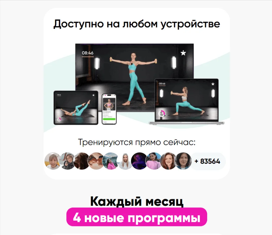 Почему стоит взять: подписка помогает выстраивать фитнес-привычки с разнообразными тренировками для дома без специального оборудования. Курсы по питанию и медитации поддерживают комплексный подход к здоровью. При покупке годового доступа можно получать денежные сертификаты за пройденные тренировки.