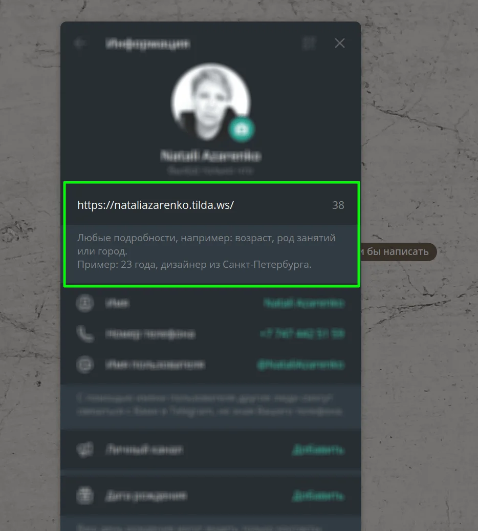 Если ведёте личный канал в Telegram, можете указать ссылку на него в своём профиле. Так пользователи смогут перейти на канал сразу из описания вашего аккаунта.
