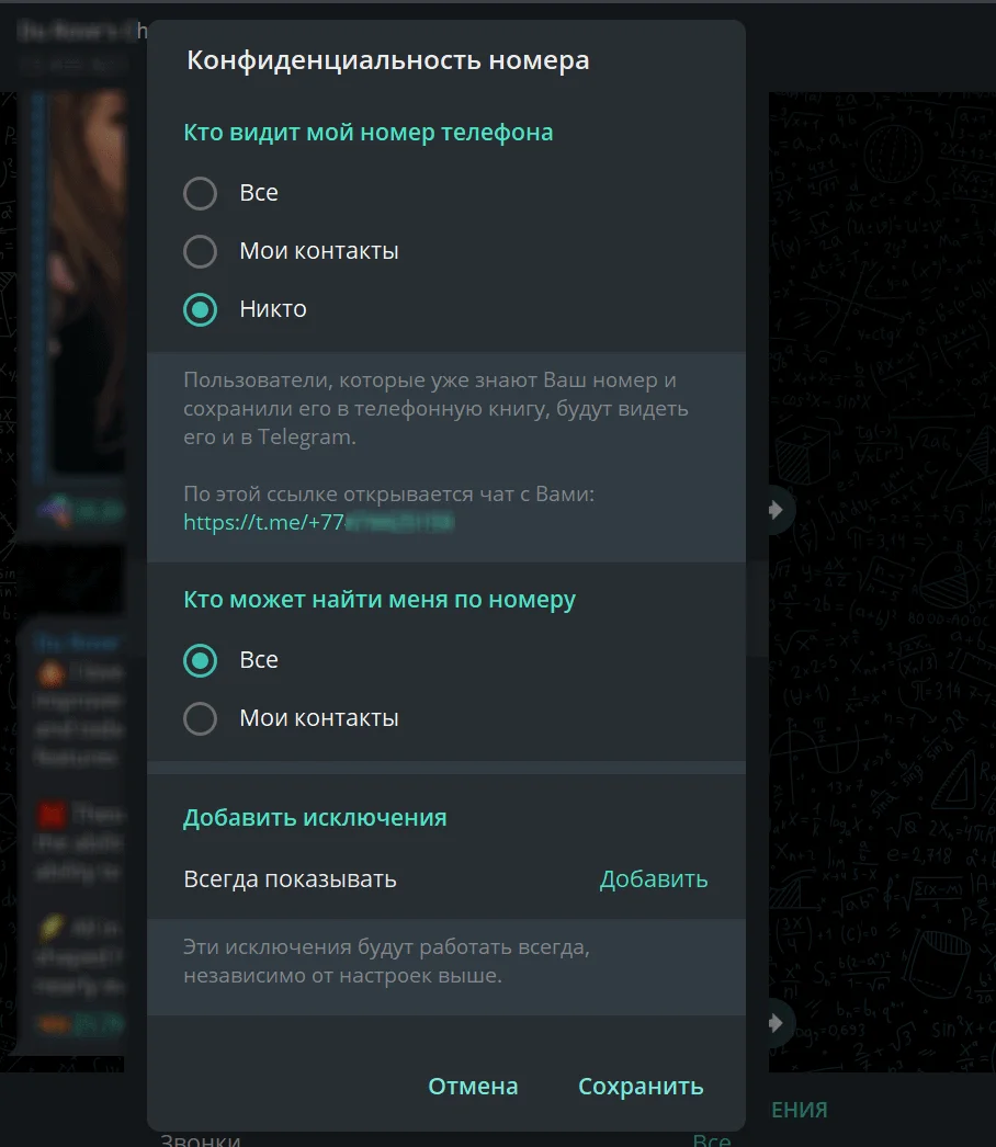 При желании можно выбрать, кто будет видеть ваш номер телефона или запретить показ полностью. Для этого в меню настроек выберите раздел «Конфиденциальность» → пункт «Номер телефона». Здесь можно указать, кто видит номер — все, никто или только контакты. Также можно частично запретить поиск по номеру и добавить пользователей, которые будут видеть телефон вне зависимости от основных настроек.