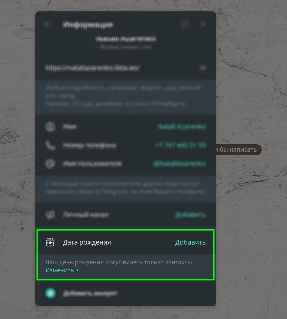 В профиле Telegram можно указать дату своего рождения. Для этого найдите пункт «Дата рождения» → нажмите «Добавить» → впишите дату.