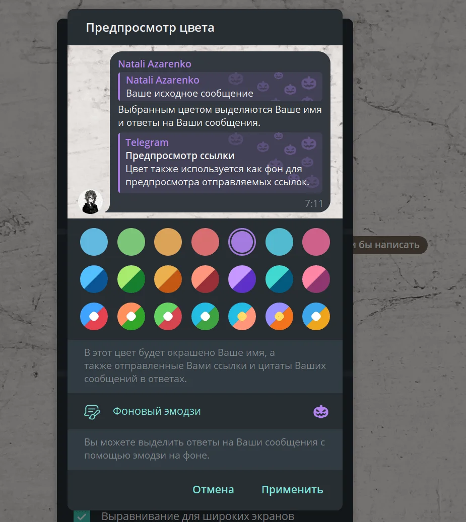 Чтобы изменить цвет, перейдите в настройки → выберите раздел «Настройки чатов» → выберите подраздел «Настройки темы» → нажмите на пункт «Цвет имени». Здесь вы можете выбрать желаемый цвет и посмотреть, как он будет выглядеть в переписке. Также можно добавить фоновый эмодзи, которым будут выделяться ответы на ваши сообщения.