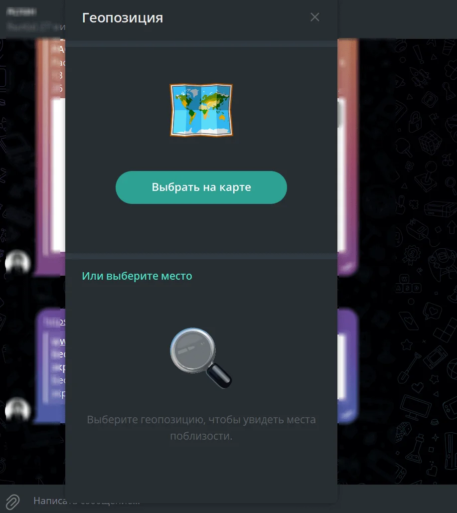 Вы можете транслировать свою геопозицию в личном чате или группе. Для включения трансляции кликните на значок вложений (скрепка в поле для сообщений) → нажмите «Геопозиция» → укажите место на карте или выберите конкретную точку среди предложенных.