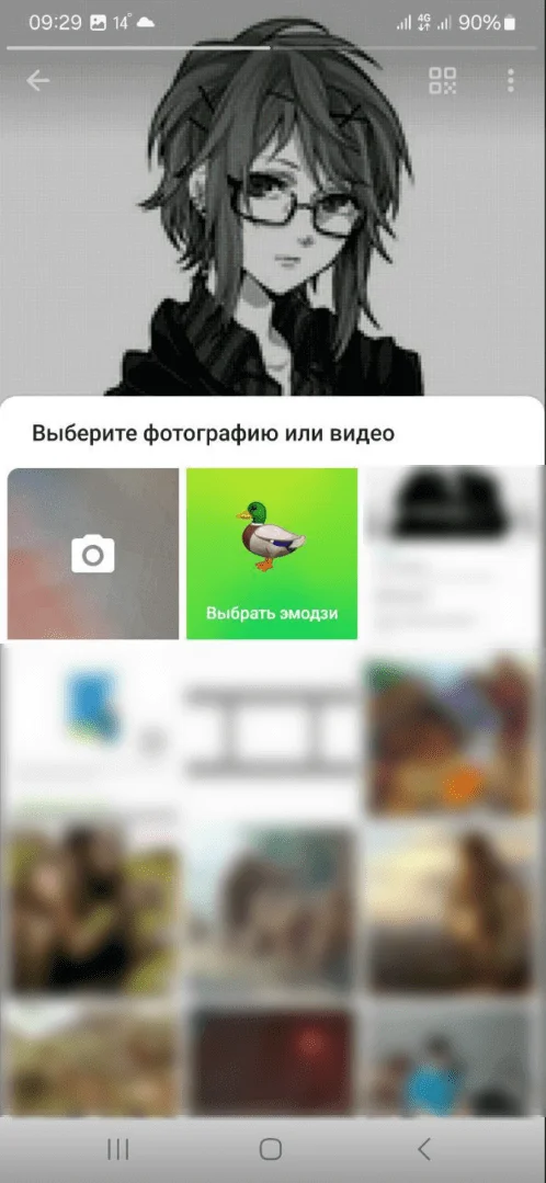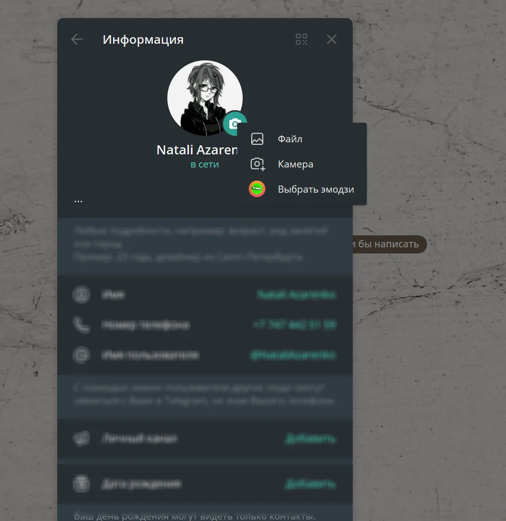 Для смены фотографии профиля кликните на значок фотоаппарата возле аватара. В открывшемся меню можно выбрать подходящий вариант — загрузить файл, сделать снимок с камеры смартфона или установить эмодзи.
