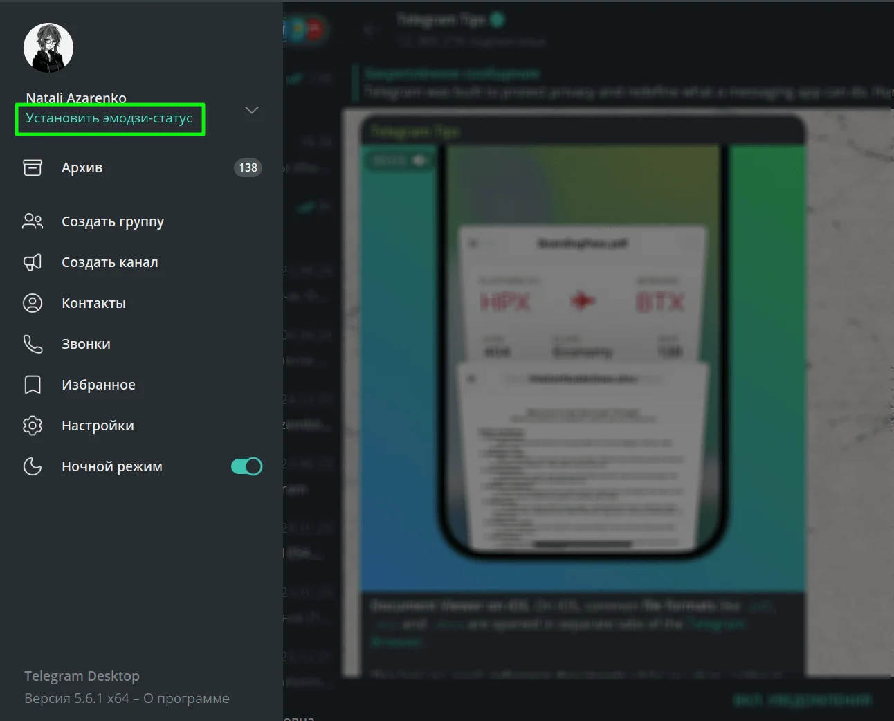 Чтобы установить эмодзи-статус в десктопной версии или на Android, кликните на поле под фотографией профиля в меню «Установить эмодзи-статус». На мобильных устройствах c iOS кликните на иконку возле слова «Чаты» в верхней части интерфейса.