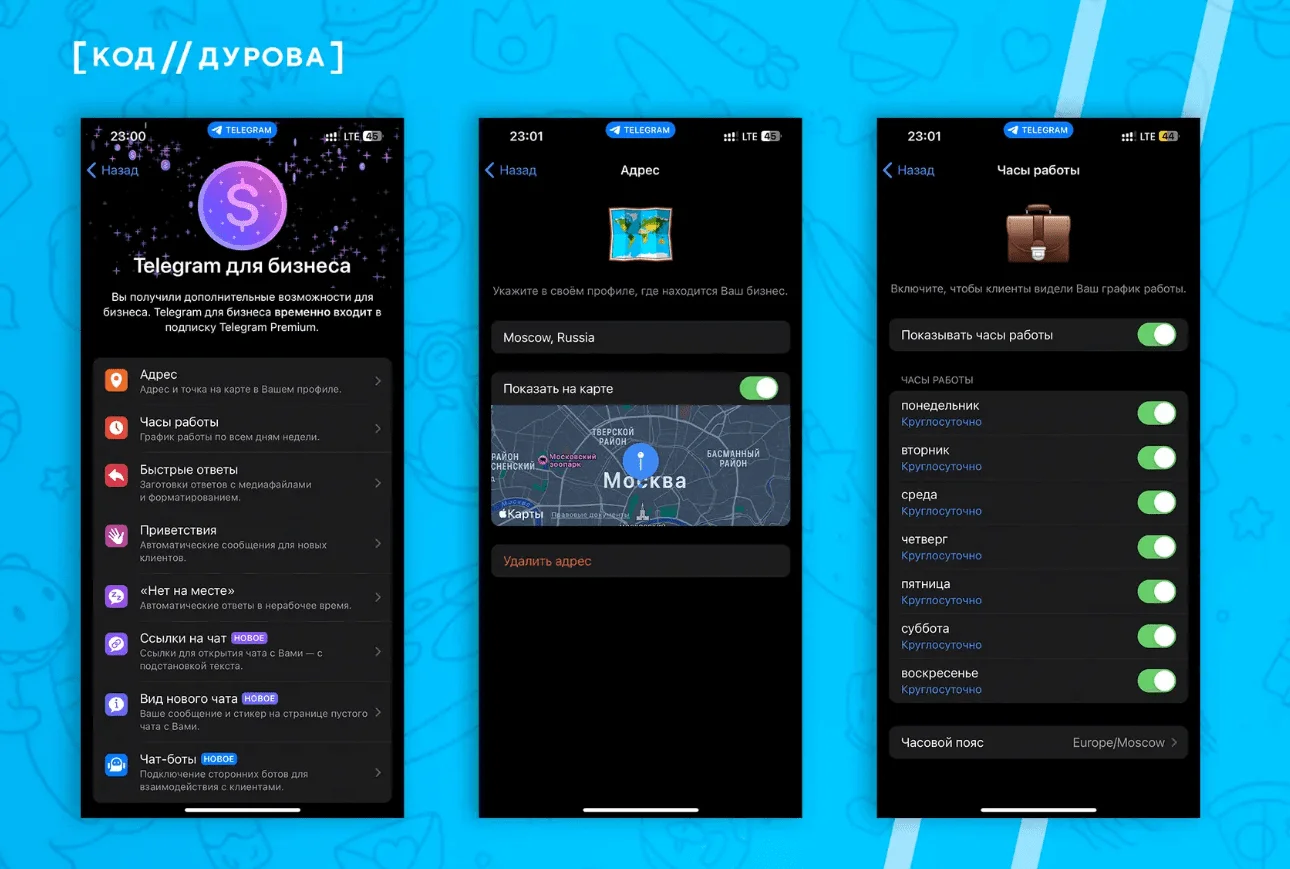 Premium-пользователи в рамках тарифа «Telegram для бизнеса» могут указать местоположение своего бизнеса и график недели по всем дням.