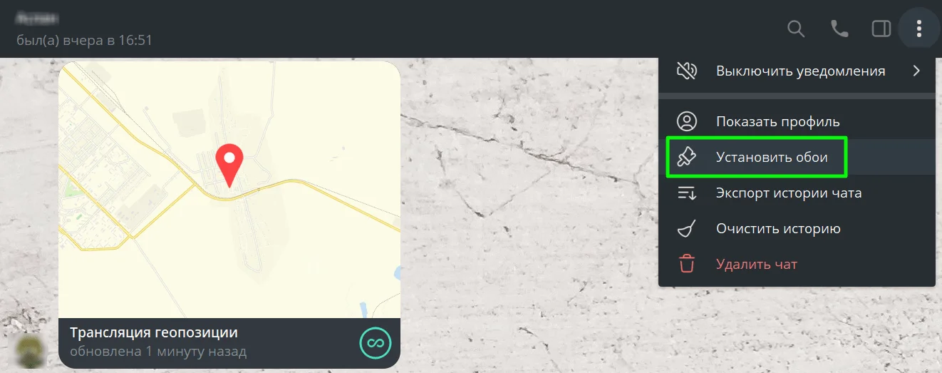 В общих настройках чатов можно выбрать обои, которые будут по умолчанию отображаться во всех группах и чатах. Эта функция работает в одностороннем порядке, только для самого пользователя и не влияет на настройки других юзеров. Но можно изменять фон личных переписок сразу и у себя, и у собеседника. Для этого откройте конкретный личный чат → перейдите в меню → выберите «Установить обои».