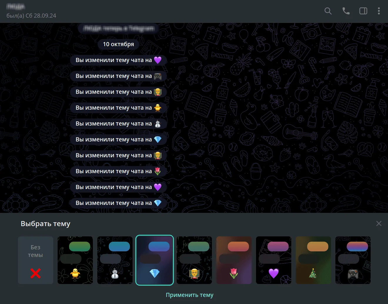 Выберите подходящий вариант из предложенных и нажмите на «Применить тему». Фон чата измениться и у вас, и у вашего собеседника. Причём подтверждение последнего не требуется. Собеседник может только вручную переустановить обои.