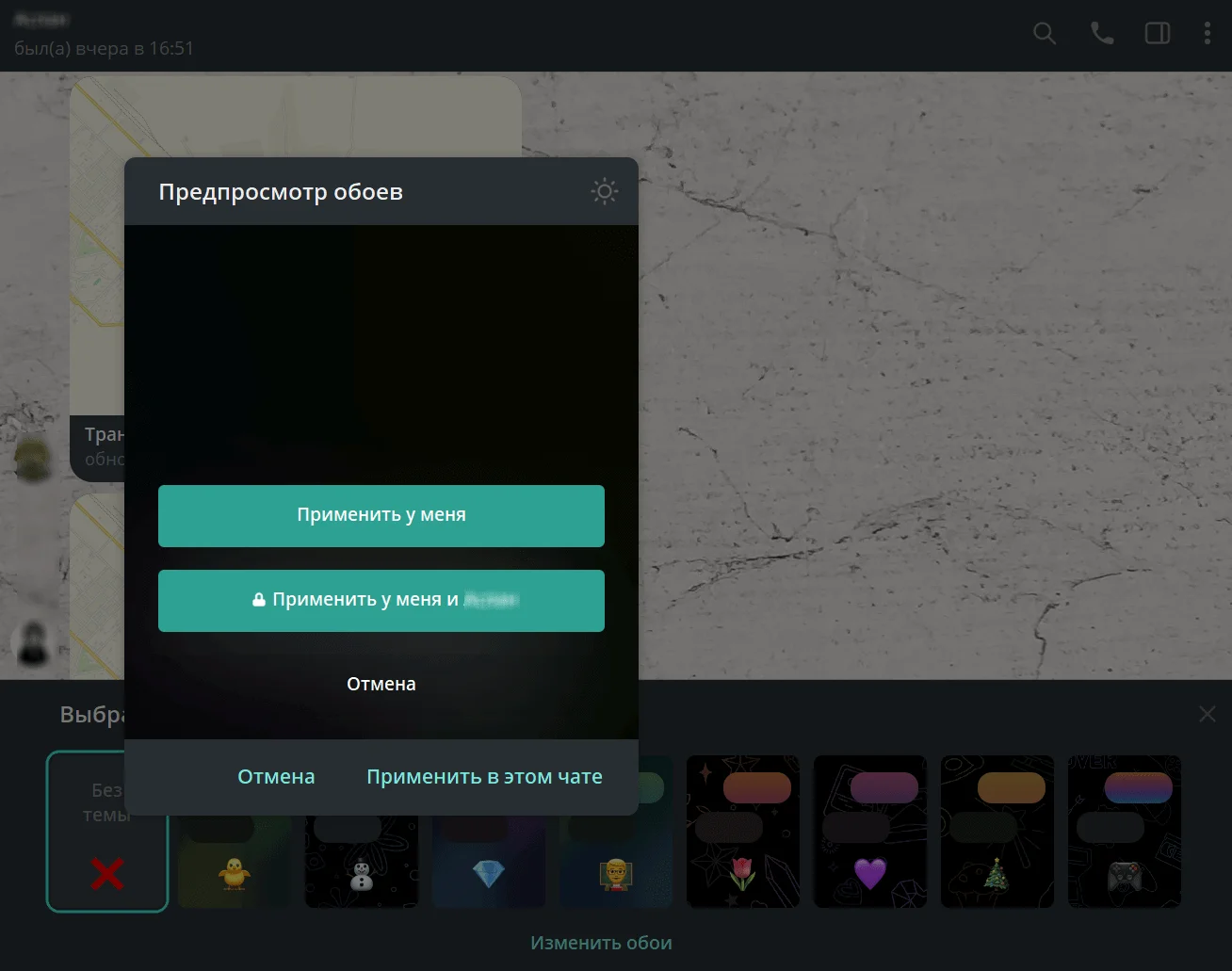 В качестве фона можно использовать собственные изображения. Для этого нужно покликать по предложенным темам до появления команды «Изменить обои». В открывшемся окошке можно выбрать обои из внутренней библиотеки или загрузить свой файл. Далее система предложит применить только у себя (доступно для всех) или у себя и у собеседника (только для Premium-пользователей).