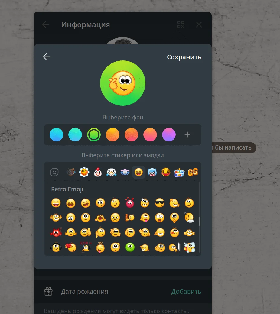 При выборе пункта «Файл» в десктопной версии можно загрузить статичное изображение. С помощью камеры можно сделать моментальное фото, отрегулировать его цвет, наложить стикер и повернуть. Если выбираете эмодзи вместо фото, можно изменить фон аватара и выбрать любой вариант из огромной библиотеки. Анимированные эмодзи в конструкторе аватаров бесплатные для всех, даже у кого нет подписки Telegram Premium.