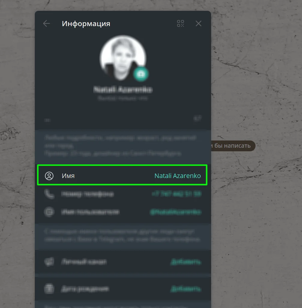 Имя в Telegram — данные, которые отображаются непосредственно под аватаром. Это те имя и фамилия, которые видны в ваших постах и сообщениях и которые видят другие пользователи при общении с вами.