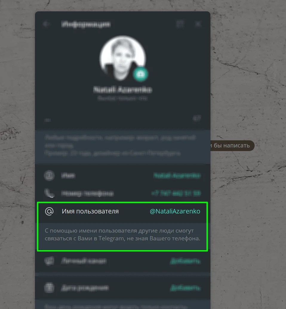 Также в Telegram есть имя пользователя. Это публичный юзернейм, по которому вас могут найти другие пользователи. Именно эти данные используются при создании ссылки на ваш профиль.