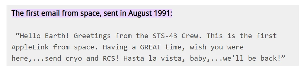 2. Первое email-сообщение из космоса. Первое космическое email-сообщение отправил на Землю экипаж корабля «ST-43 Atlantis» 9 августа 1991 года. Для передачи электронного письма космонавты Шеннон Люсид и Джеймс К. Адамсон использовали ПК Macintosh и программное обеспечение от Apple. Стоит отметить, что это была третья попытка — первые две оказались неудачными из-за проблем с соединением.
