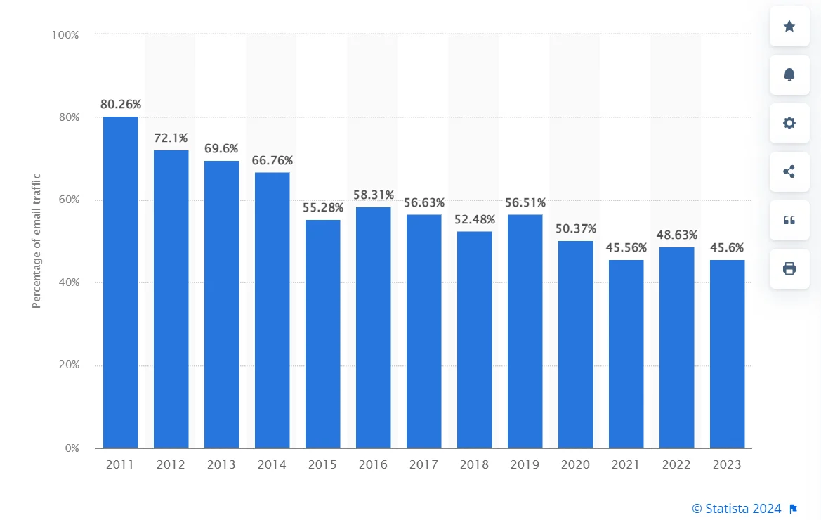 9. Процент спама в современной email-рассылке. По статистике от 2022 года, почти 49% из 333 млрд ежедневно отправляемых электронных писем считаются спамом. Это примерно 162 млрд спам-сообщений каждый день. В 2023 году спамом признано 45,6% всех отправленных email-писем в мире.
