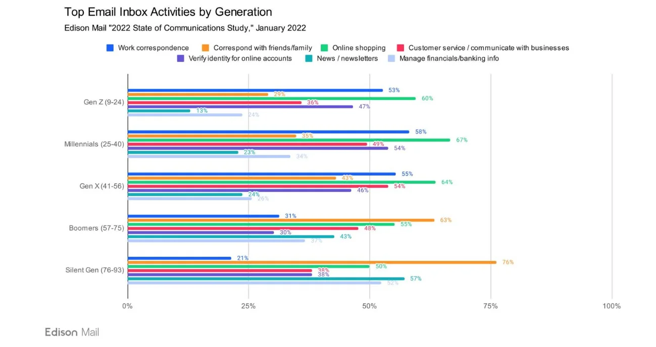 20. Разница поколений. Опрос Edison Mail показал, что люди более старшего поколения чаще используют электронную почту для личного общения. А вот более молодые люди предпочитают использовать email как деловой инструмент.