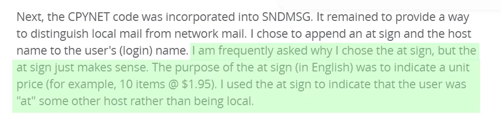 24. Первое применение. В 1971 году Рэй Томлинсон использовал знак @ для разделения имени пользователя и имени компьютера. Эта практика сохранилась и используется и в наши дни — комбинация «user@host» остаётся стандартом для адресов электронной почты.