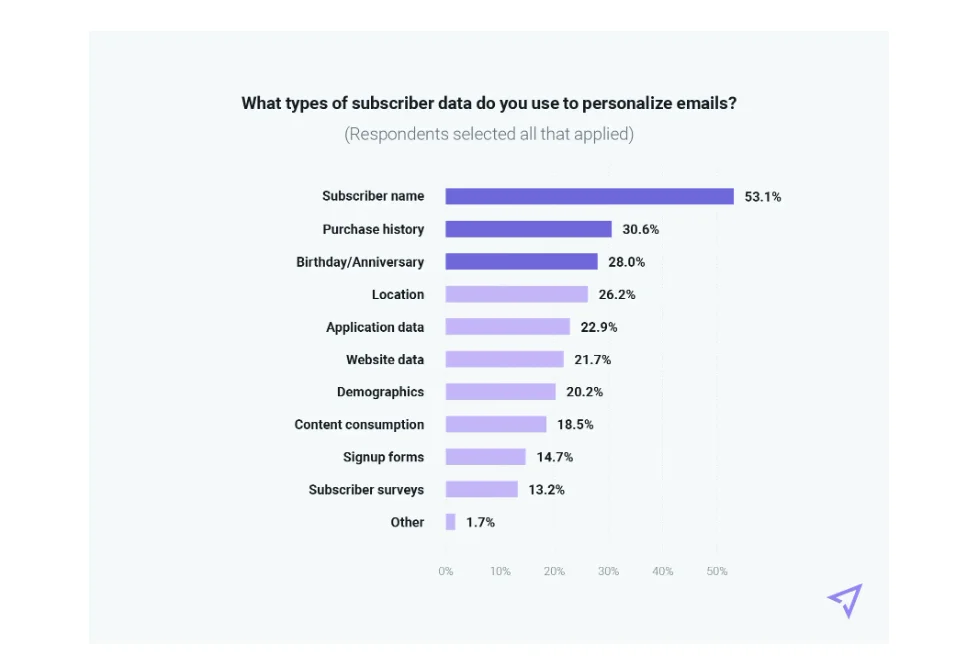 28. Персонализация по имени. 53,1% респондентов опроса Inbox Insights заявили, что для персонализации чаще всего используют имя подписчика.