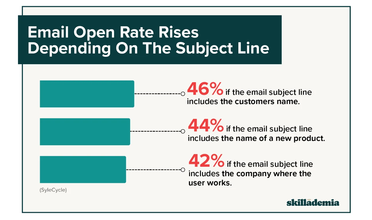 35. Пользователи охотнее открывают письма с указанием имени в теме. Вероятность открытия электронного письма по теме достигает 46,2%, если в нем учитывается имя клиента. Также внимание адресатов привлекают название нового продукта и компания, в которой работает пользователь.