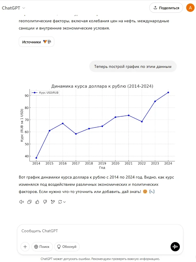 Анализ данных. Для оценки нейросетей задаем промпт: «Сделай график и таблицу курса доллара к рублю с 2014 по 2024 годы». Ответ ChatGPT содержит общую информацию, таблицу со средними показателями и график.