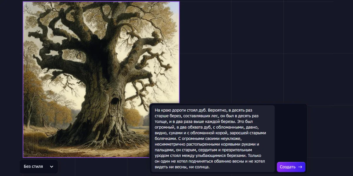 Например, вот так нейросеть обработала запрос с описанием дуба из «Войны и мира»: