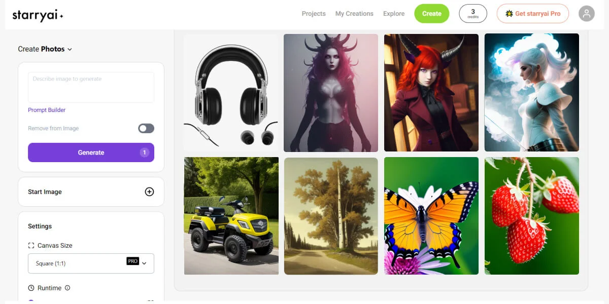 StarryAI — удобный AI-сервис для создания изображений. Он работает в браузере и через мобильные приложения для iOS и Android. Всё работает, как и везде: описываете, что хотите увидеть, а ИИ-алгоритм преобразует ваши слова в уникальные картинки.