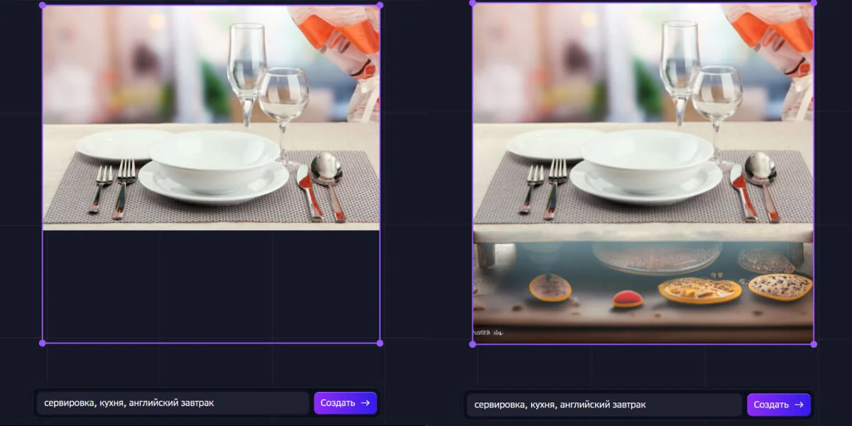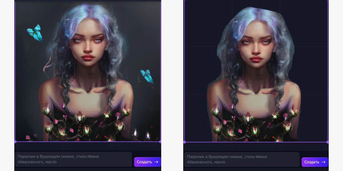 Кроме генерации картинок с нуля, Kandinsky может дорисовывать уже готовое изображение. Для этого нужно загрузить картинку с компьютера и в поле запроса написать, что вы хотите сгенерировать. Сервис дорисует выделенную область или деталь на готовом изображении без изменений в остальной части картинки.