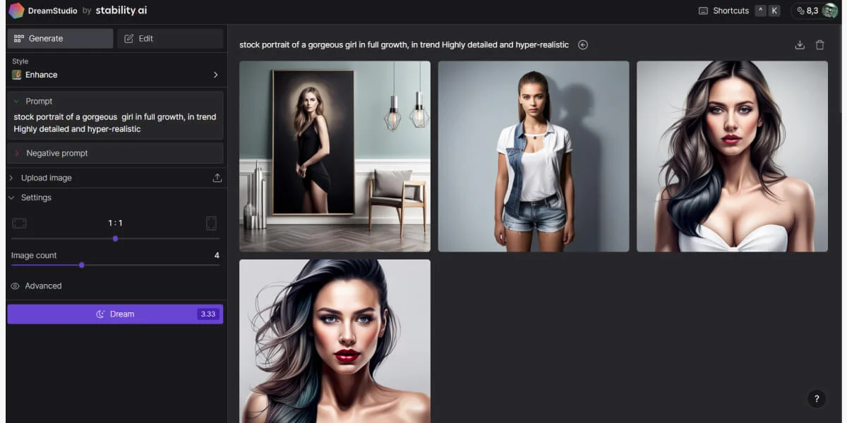 Dreamstudio.Ai — официальный портал, созданный компанией-разработчиком нейросети Stable Diffusion. В отличие от Stable Diffusion, которую нужно устанавливать на ПК большой мощности, Dreamstudio.Ai можно использовать онлайн на сайте — это удобно и доступно для всех.