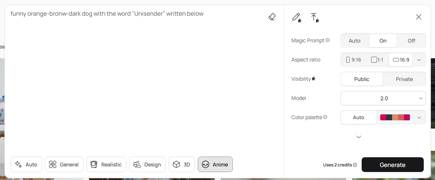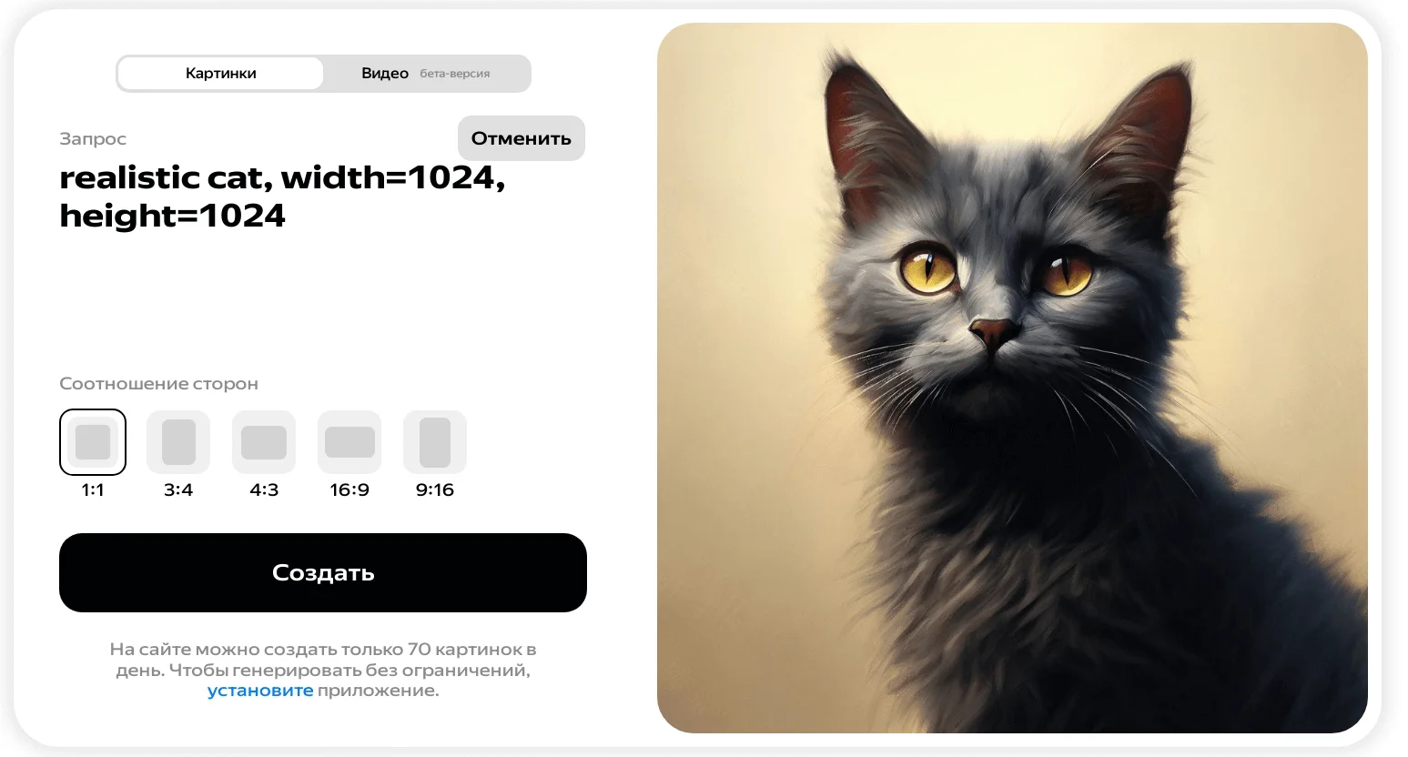 Чтобы создать картинку, введите текстовый запрос в соответствующем поле, укажите стиль слева от запроса и выберите соотношение сторон.