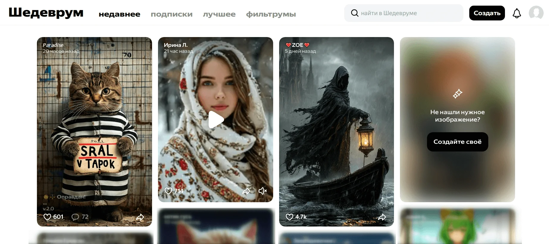 Фишка сервиса в том, что он работает по подобию соцсети. Все генерации пользователей публикуются в ленте — посты можно лайкать и оставлять под ними комментарии. Если нравятся чьи-то работы — можно подписаться на страницу создателя. Под каждым опубликованным изображением прописан промпт, чтобы пользователи могли учиться составлять их или просто копировать.