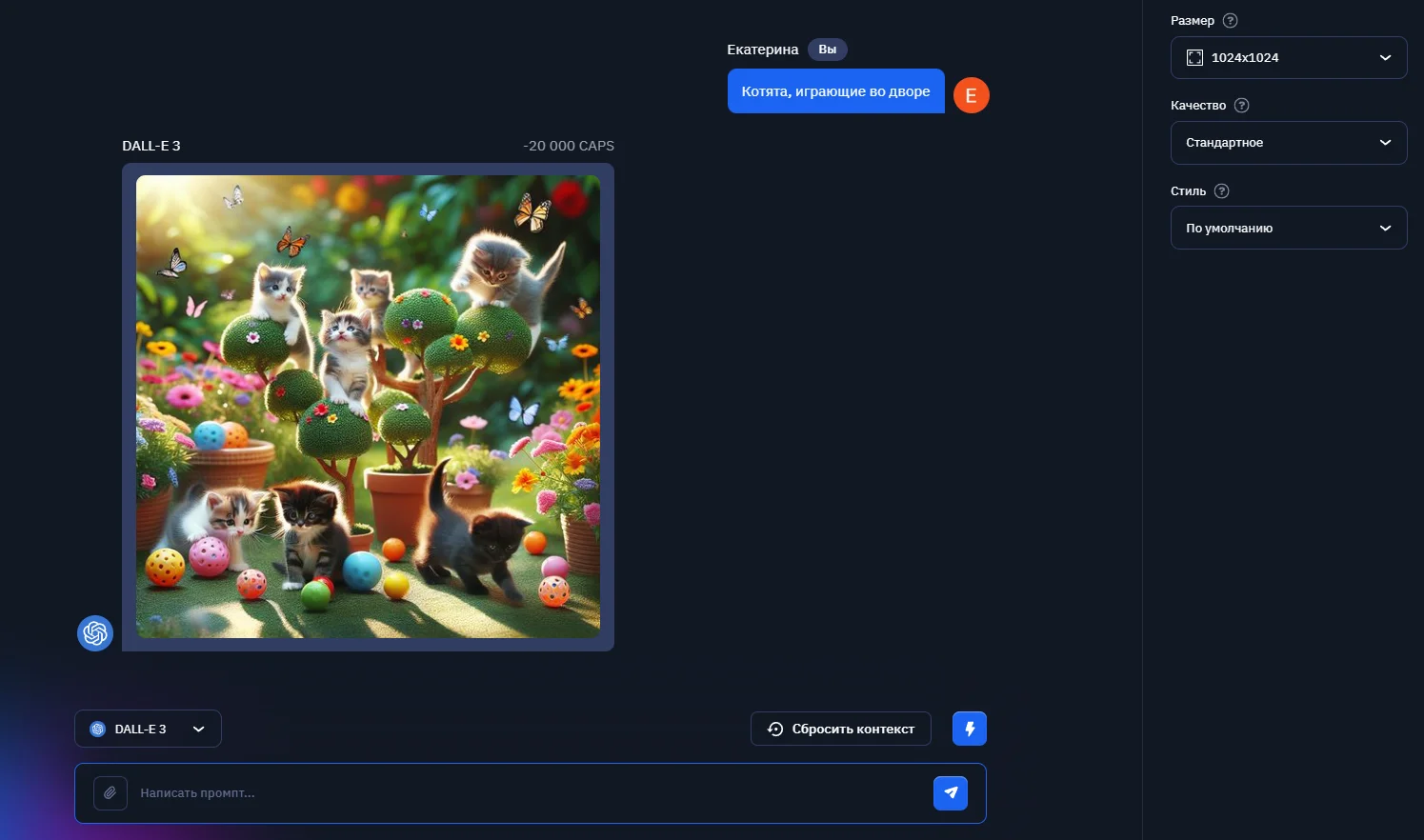 Аналогично работает и DALL-e 3, где вы можете настроить качество изображения, выбрать масштаб и стиль генерации. Эта нейросеть также прекрасно отработала запрос с котятами (как на примере выше) с разницей в том, что DALL-e 3 генерирует за раз одно изображение.