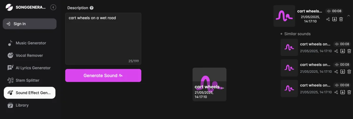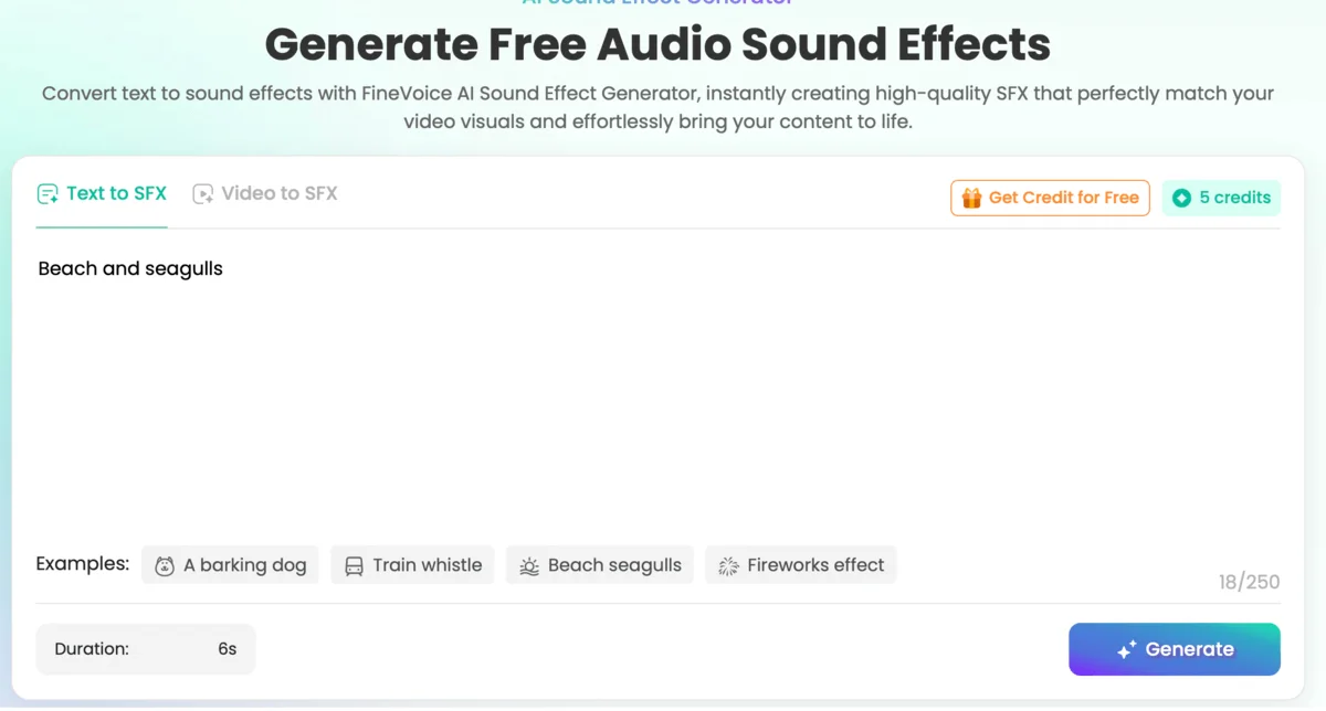 FineVoice — онлайн-сервис, который позволяет генерировать звуковые эффекты по текстовому описанию или под конкретный видеоряд. Работает просто: введите на английском, какой звук вам нужен — например, thunder, footsteps on wood, car crash — и получите несколько аудиофайлов на выбор.