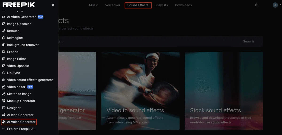 Freepik — ИИ-сервис для генерации изображений, иконок, видео и озвучки. В разделе AI Voice Generator можно озвучивать тексты и создавать звуковые эффекты к визуальному контенту. Также тут доступна большая библиотека с готовыми звуками и музыкой.