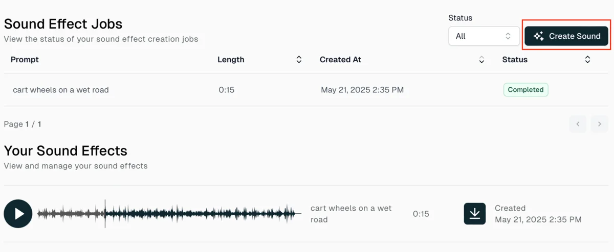 Чтобы создать звук, нажмите Create Sound и заполните форму: введите промпт на английском, выберите длину аудио и укажите, через сколько секунд должен начаться звук.