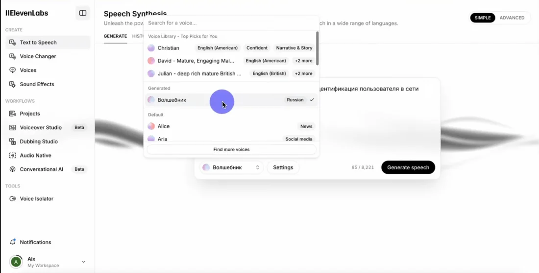 | ✅ Много инструментов для работы с аудио, в том числе уникальный режим создания оригинального голоса по текстовому описанию | ❌ Нет русскоязычного интерфейса |