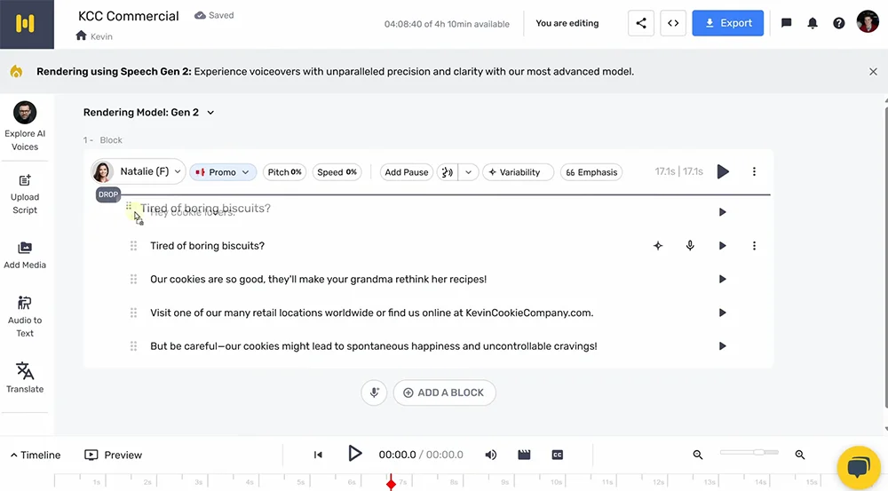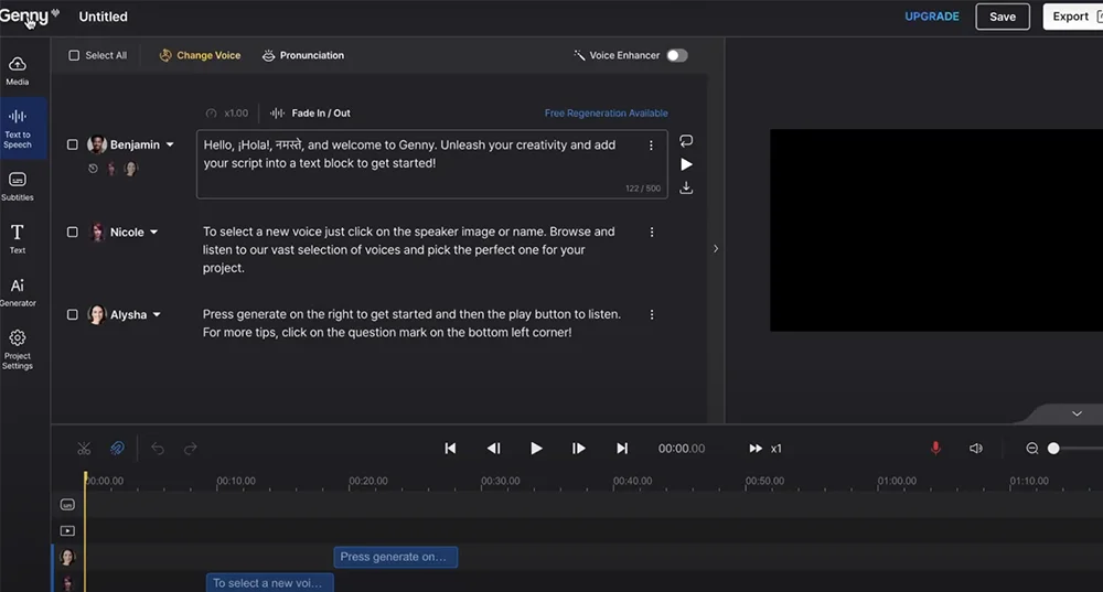 В нейросети есть встроенный видеоредактор с большим количеством настроек дубляжа и озвучки. Также есть продвинутый аудиоредактор, где можно создавать сложные проекты с диалогами, используя сразу несколько разных голосов. Есть русскоязычный интерфейс.