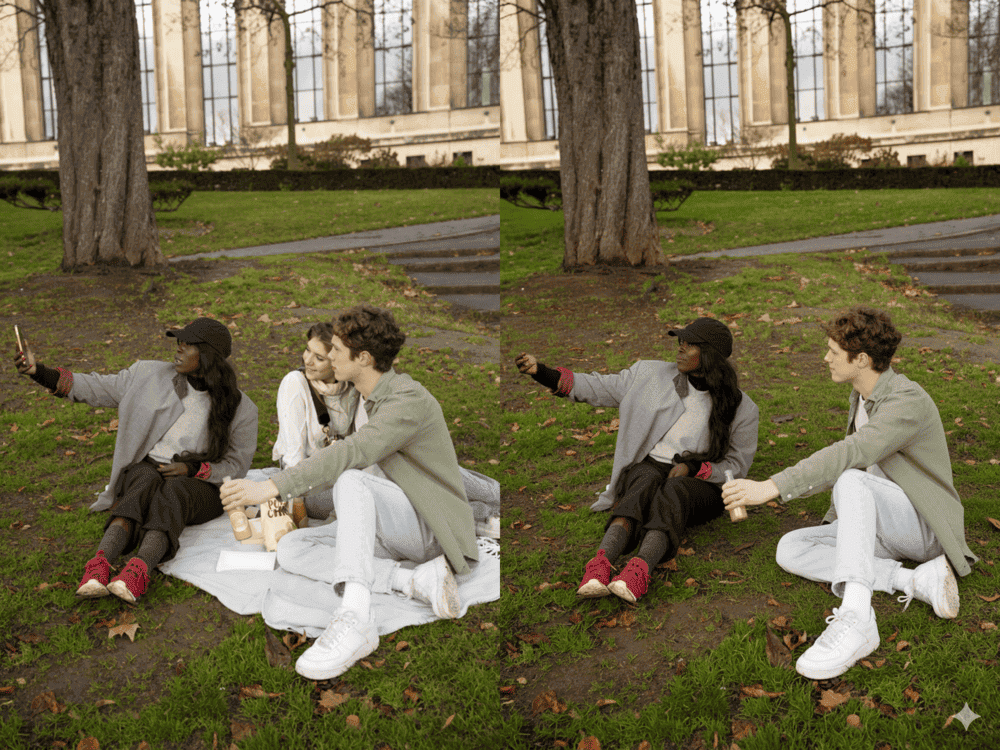 Попросили нейросеть убрать человека посередине. Вместе с ним ИИ удалил и плед, но после обработки фото выглядит так, будто третьего человека там никогда не было.