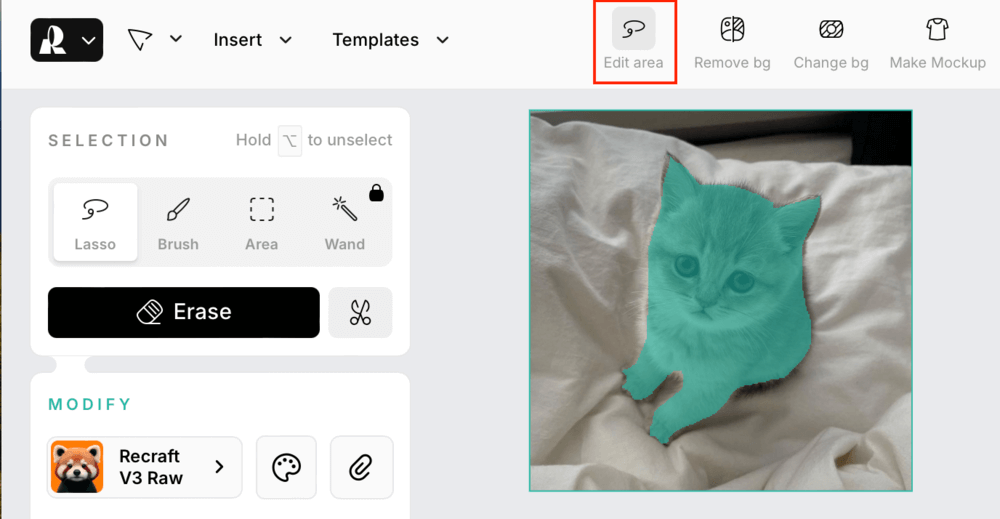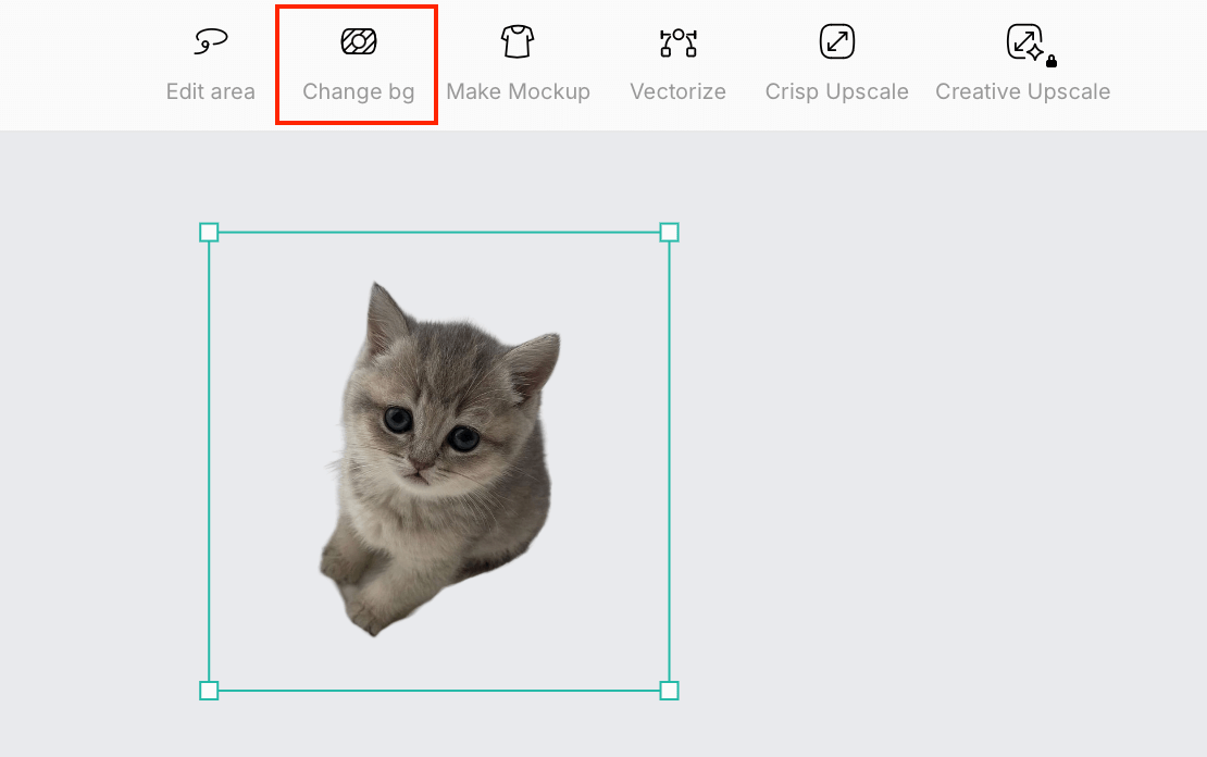 Фон удалился быстро, но не идеально: у котика получились квадратные лапки. Видимо из-за тени ИИ обрезал их снизу. Откорректировать картинку можно с помощью инструмента Edit area. Тут же получится заменить фон и даже сделать изображение векторным, чтобы использовать при оформлении сайта.