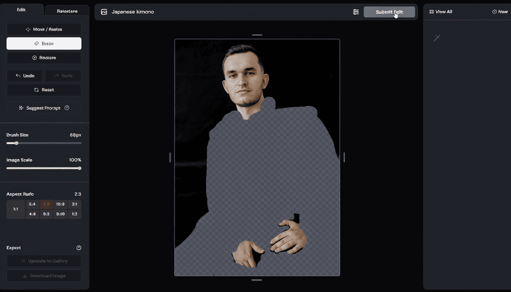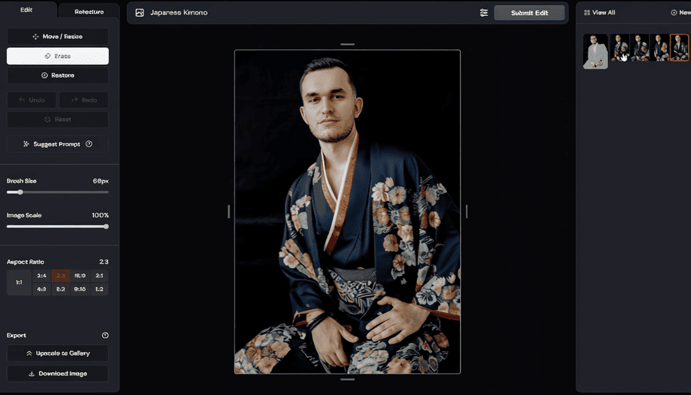 Сервис позволяет редактировать изображения с помощью запросов как и в Qwen Editor. Для этого нужно перейти в раздел Edit в верхней панеле Krea.