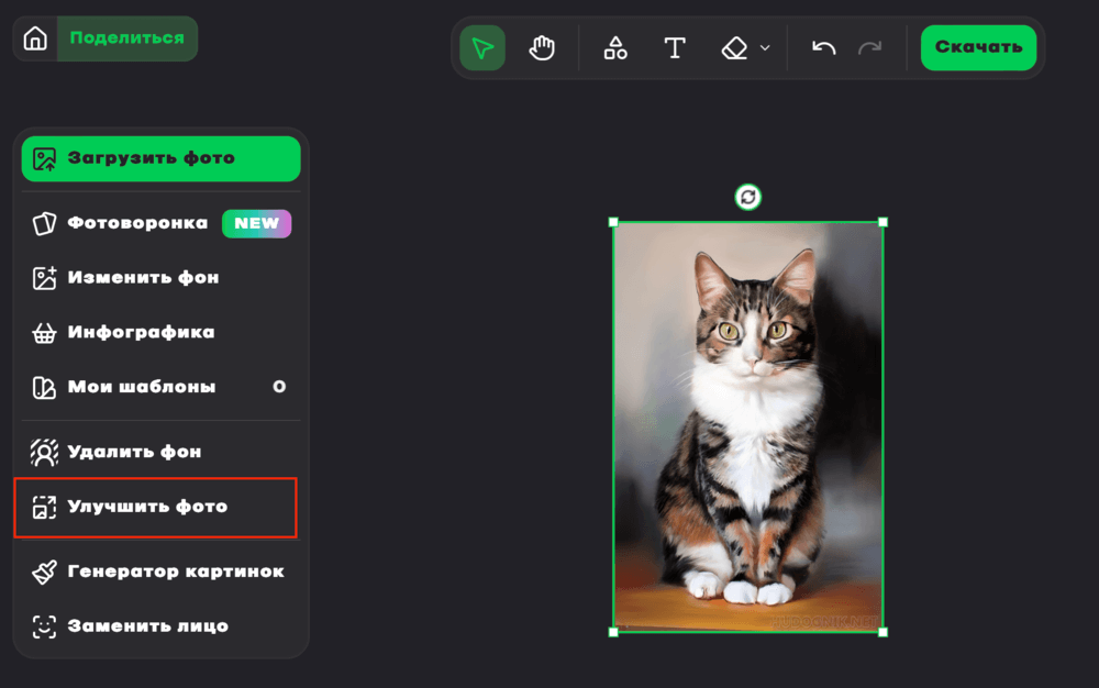 Онлайн-сервис для обработки фото. Просто загрузите фото, остальное ИИ возьмет на себя. Здесь же можно потом отредактировать изображение и добавить эффекты.