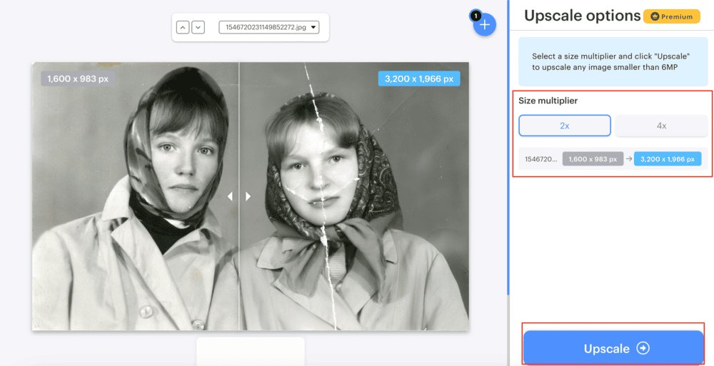 Работает сервис просто: загрузите фото, выберите масштаб и нажмите Upscale.